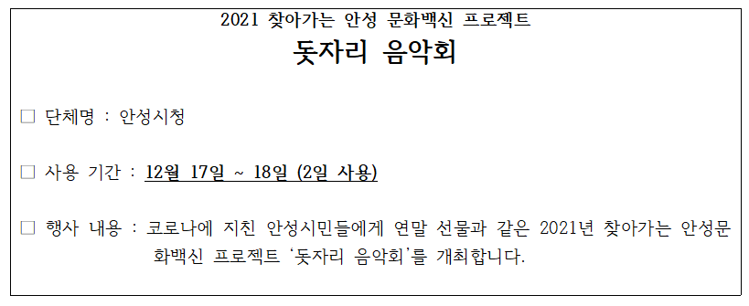 12월 17일 ~ 18일 다목적 체육관 이용 제한 안내 ![]() 안녕하세요? 서안성체육센터 관리·운영 조례 제4조에 의거하여 안성시청 주최 돗자리 음악회를 진행합니다. 상기 내용을 유의하시어 이용에 차질이 없으시길 바랍니다. |