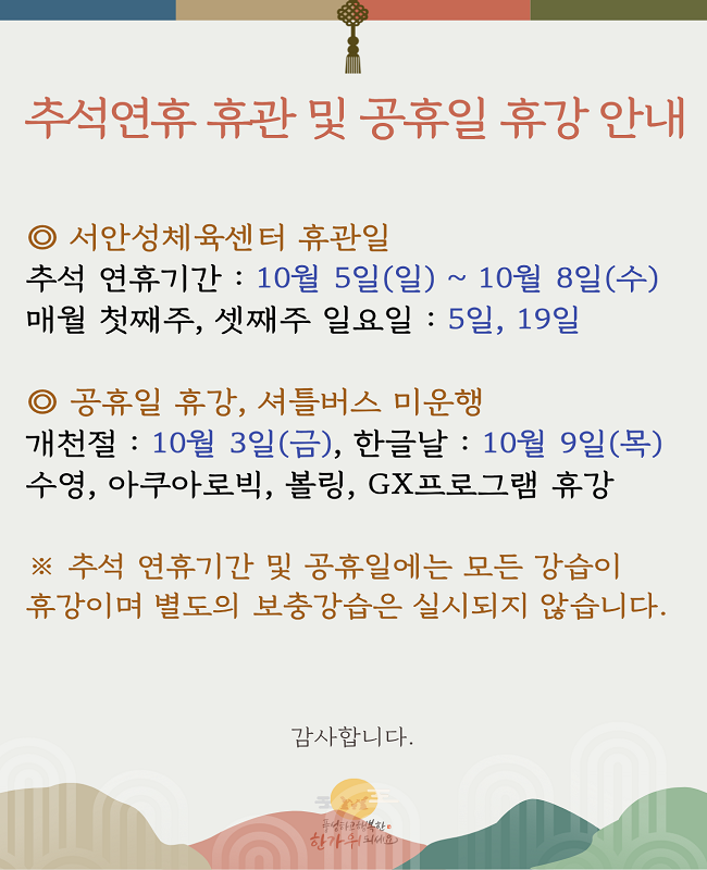 추석연휴 휴관 및 공휴일 휴강 안내2025-09-25 | |||