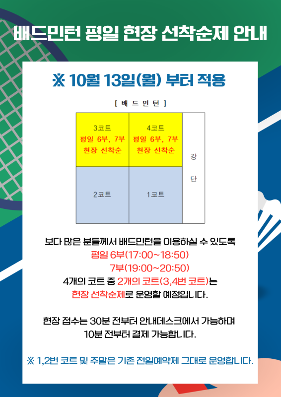 배드민턴 평일 현장 선착순제 안내2025-09-29 | |||