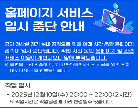 | 서안성체육센터 홈페이지 서비스 일시 중단 안내(12.10 20시~)2025-12-08 | |||