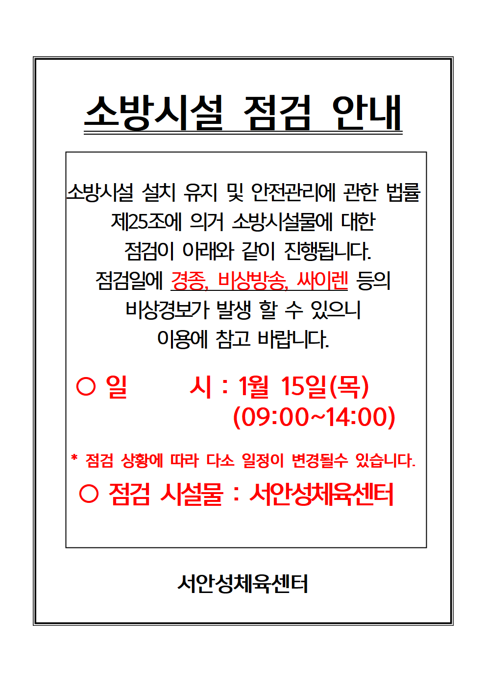 1월 15일(목) 소방시설 점검 안내