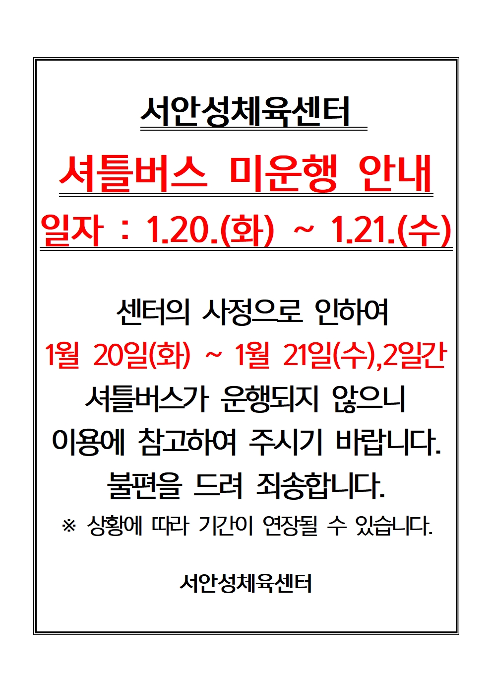 | (긴급) 서안성체육센터 셔틀버스 미운행 안내2026-01-19 | |||