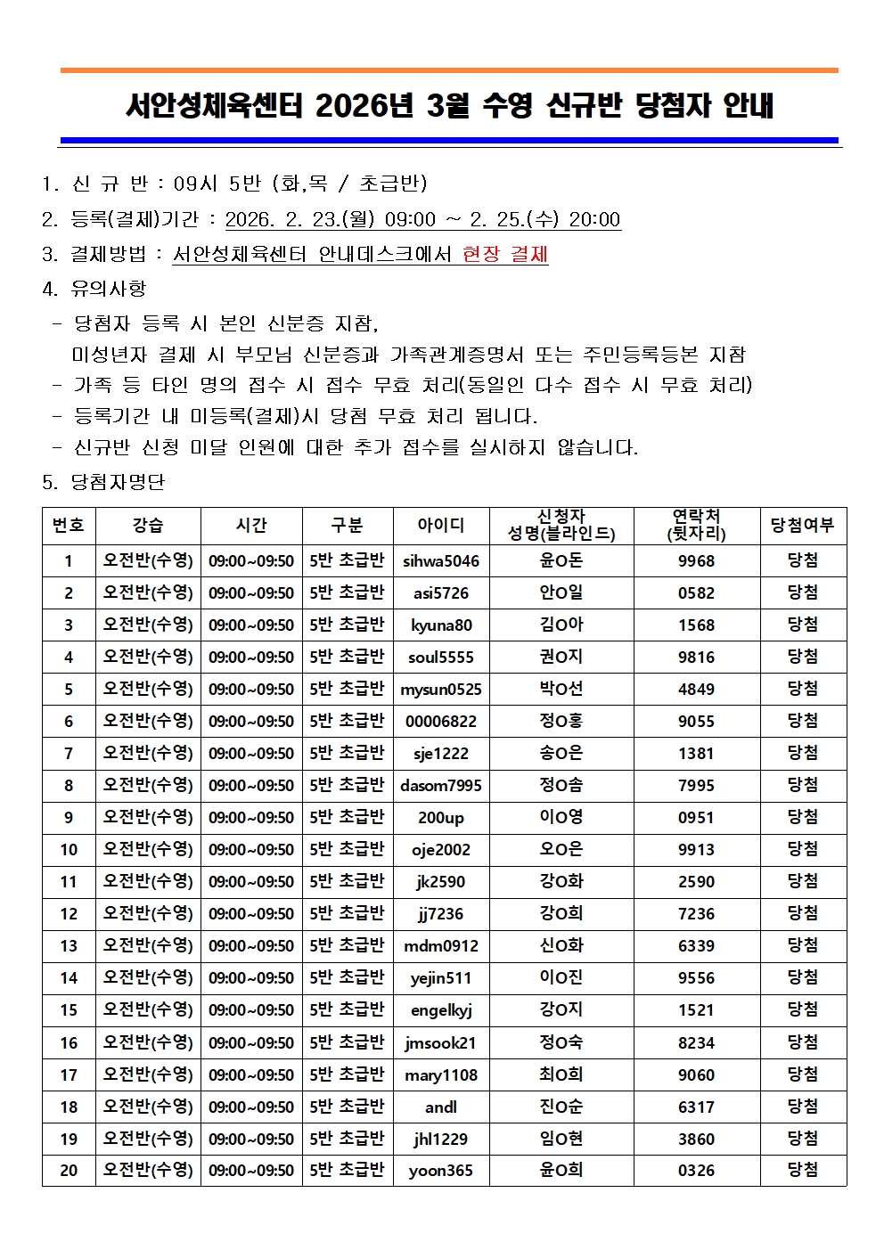 | 2026년 3월 수영 신규반(09시 5반 화,목 초급반) 당첨자 안내2026-02-13 | |||