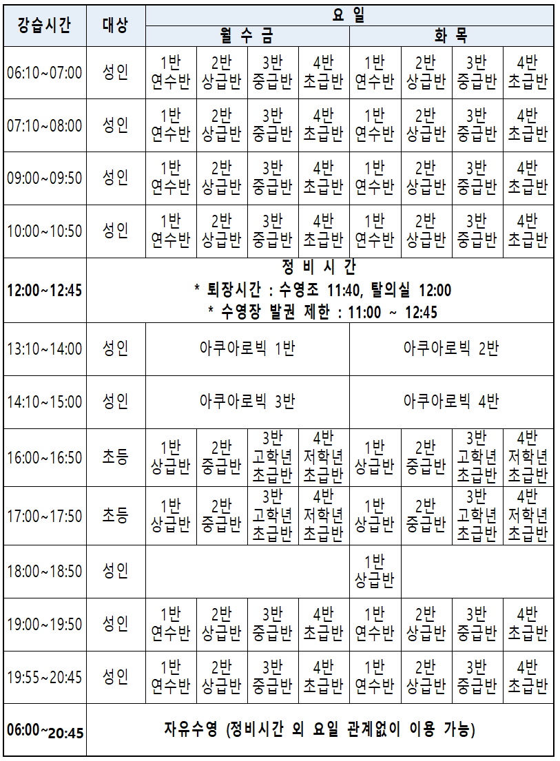ㆍ수영 강습일은 강습 후 자유수영이 제한(강습일 외 자유수영 가능)