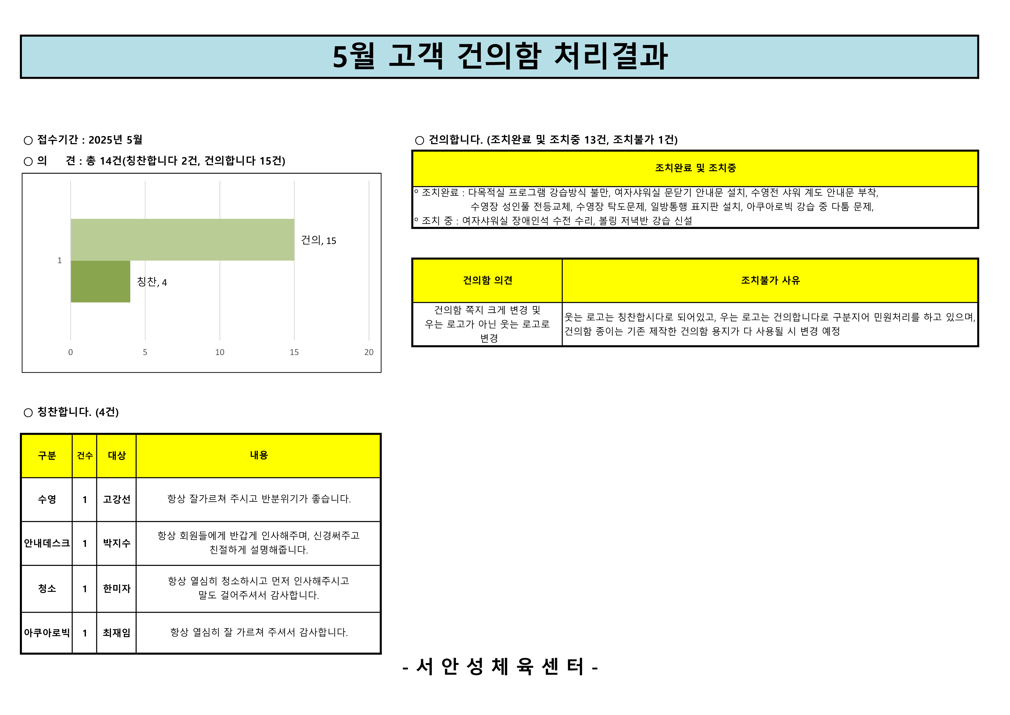 서안성체육센터 로비에 설치된 익명 건의함으로 접수된 내용과 처리결과를 매달 이곳에 게시하고 있습니다.