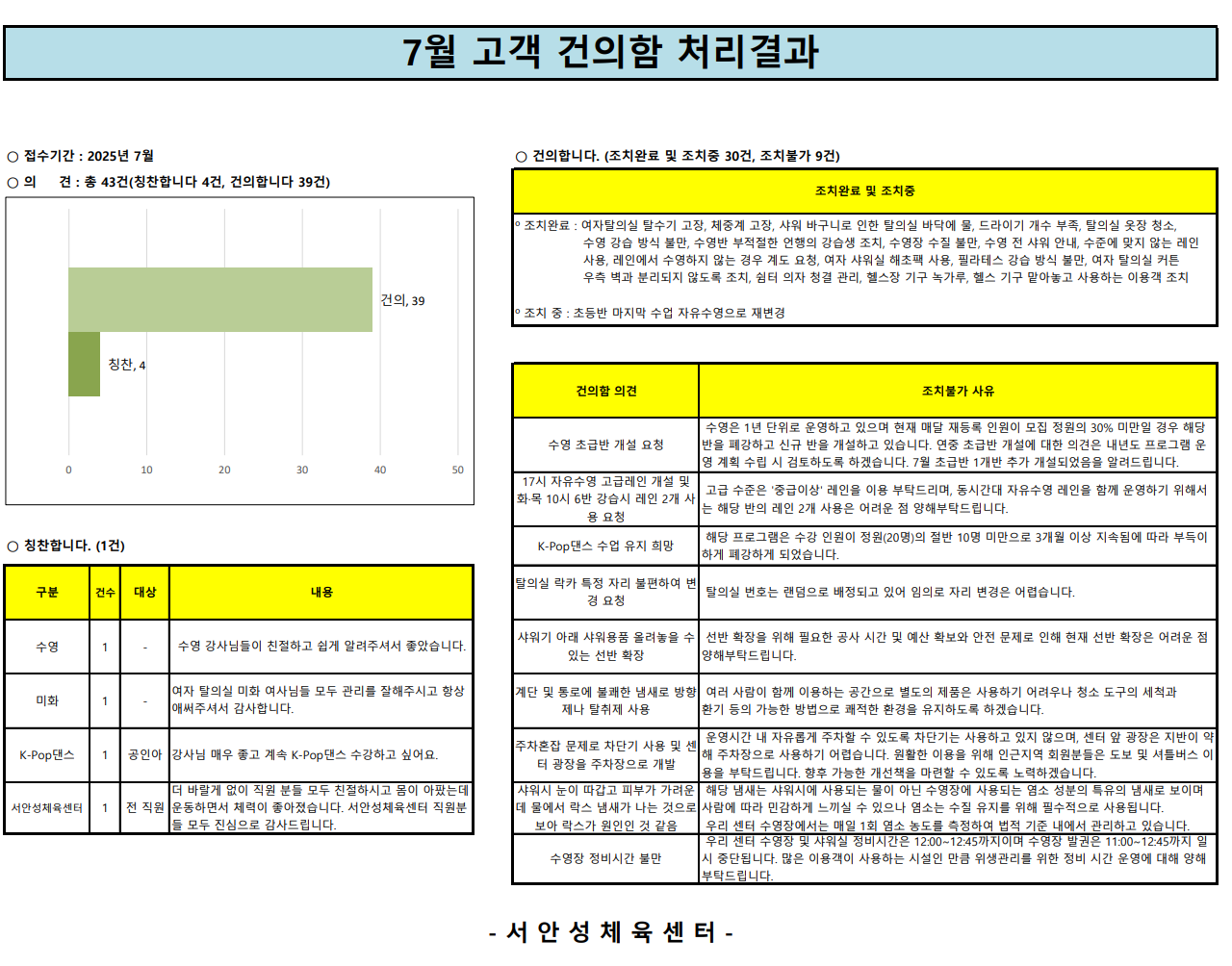 서안성체육센터 로비에 설치된 익명 건의함으로 접수된 내용과 처리결과를 매달 이곳에 게시하고 있습니다.