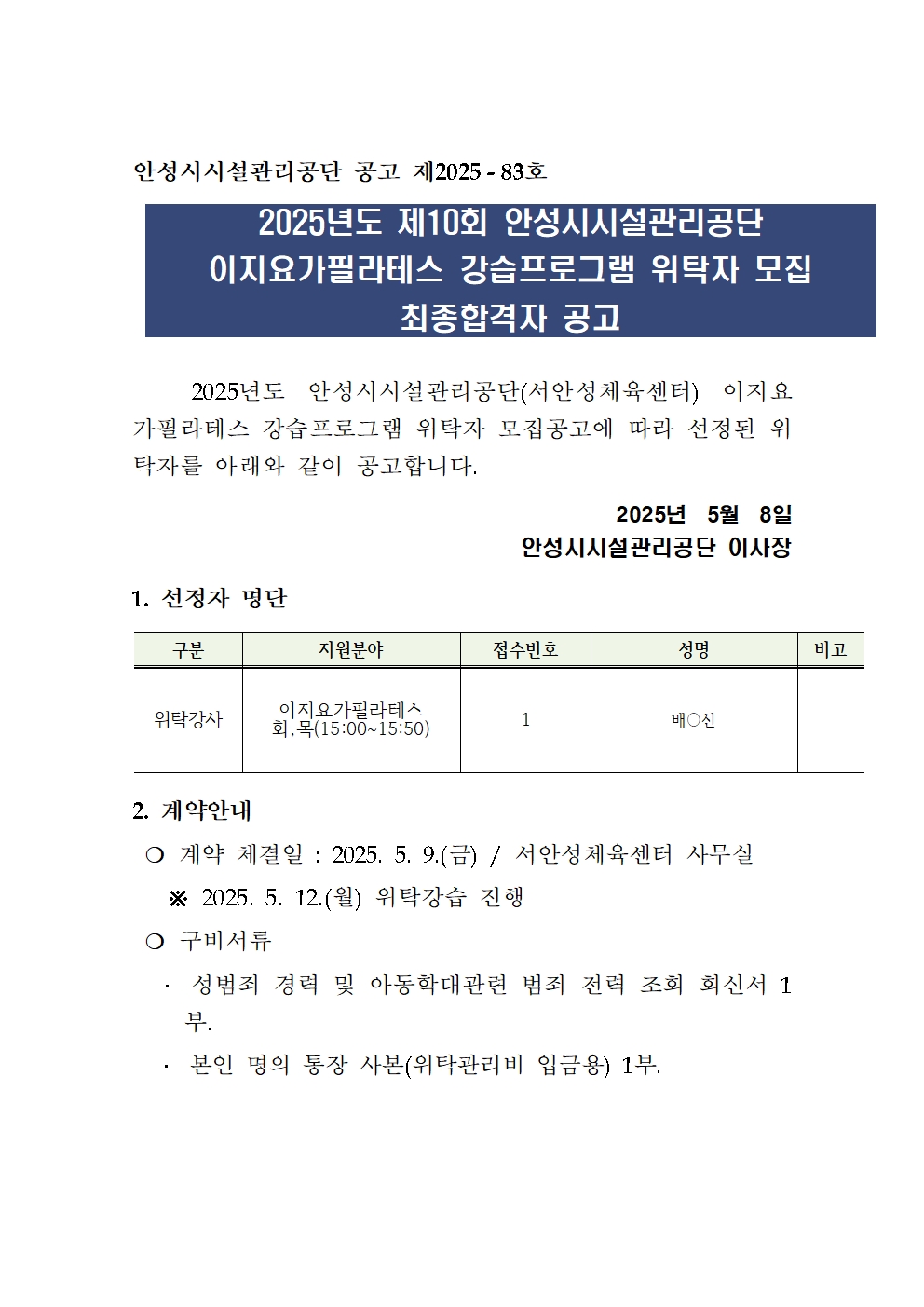 | 2025년 제10회 안성시시설관리공단 강습프로그램 위탁자 최종합격자2025-05-08 | |||