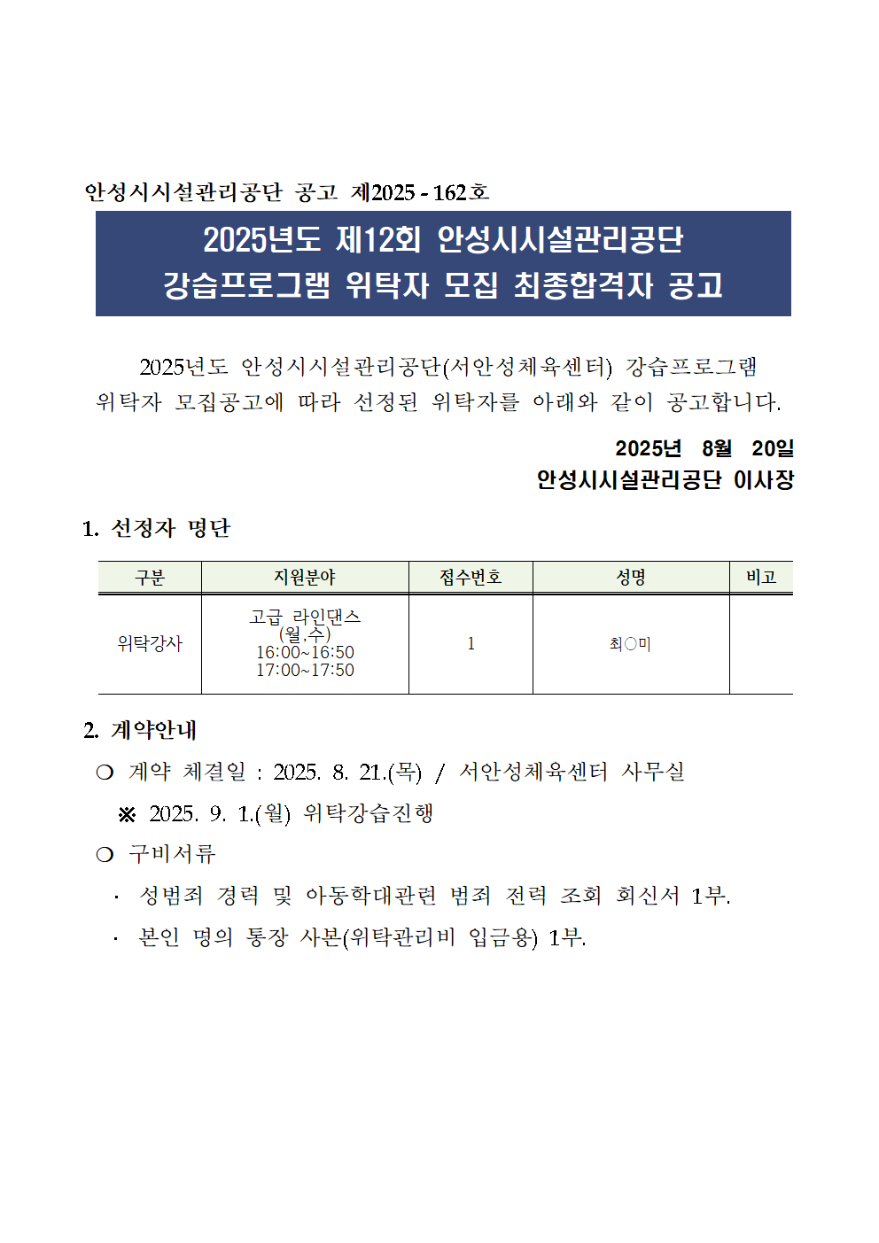 | 2025년 제12회 안성시시설관리공단 강습프로그램 위탁자 최종합격자2025-08-20 | |||