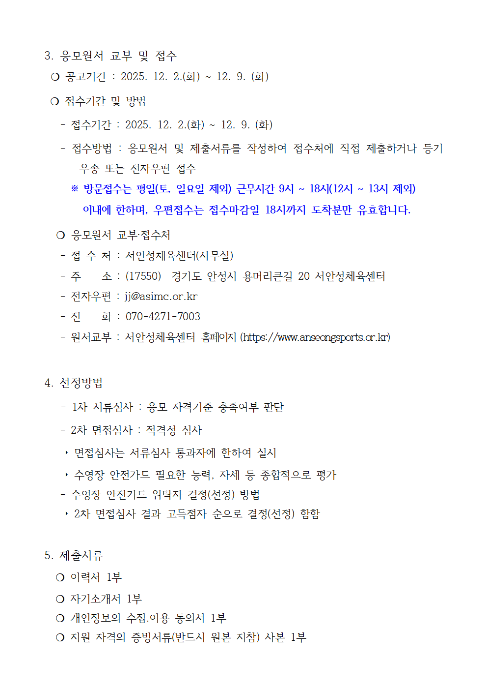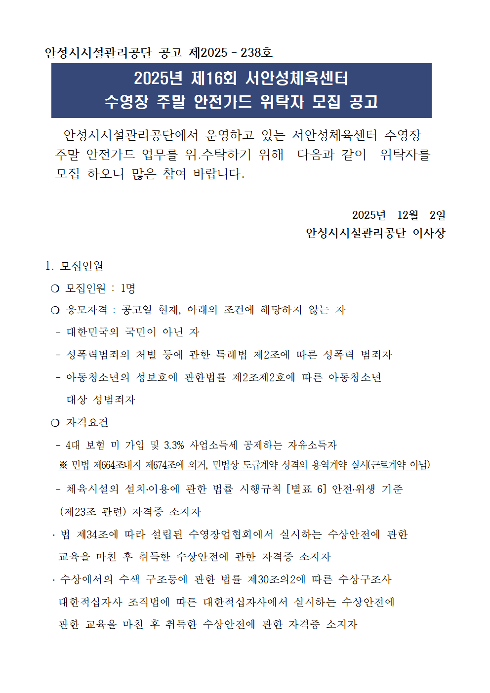 | 2025년 제16회 서안성체육센터 수영장 주말 안전가드 위탁자 모집 공고2025-12-02 | |||