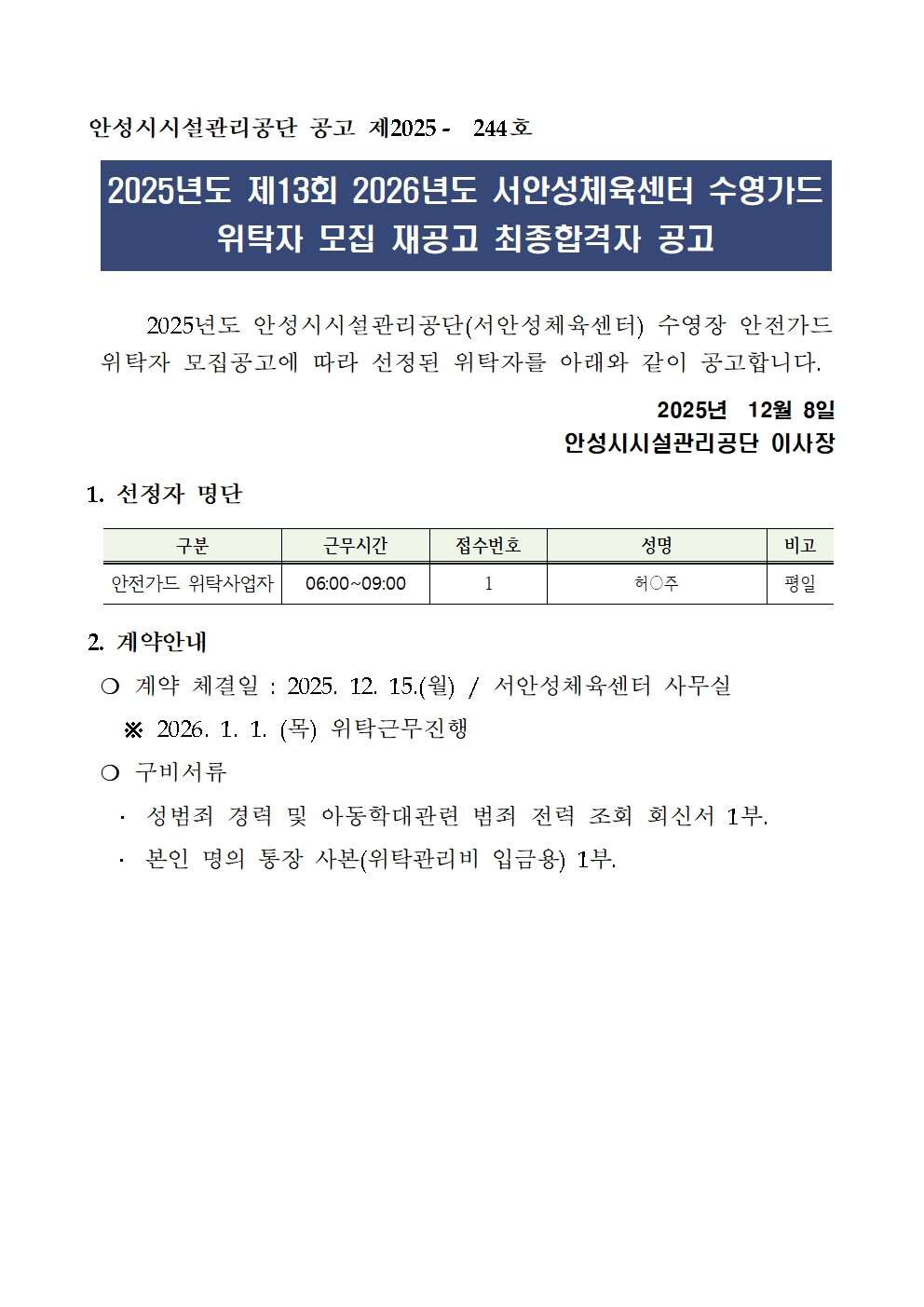 | 제13회 서안성체육센터 수영장 안전가드 위탁자 모집 재공고 최종합격자공고2025-12-08 | |||